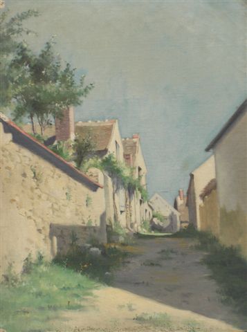 Adrien LAVIEILLE. Chemin de terre dans un village. Huile sur toile. 39,5 x 30 cm.