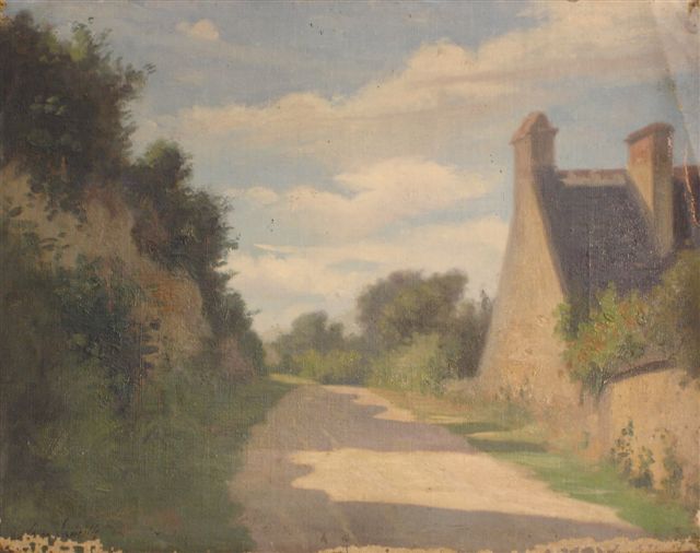Adrien LAVIEILLE. Chemin abrasé en bord de ferme. Huile sur toile. Signée en bas à gauche. 31 x 40 cm.
