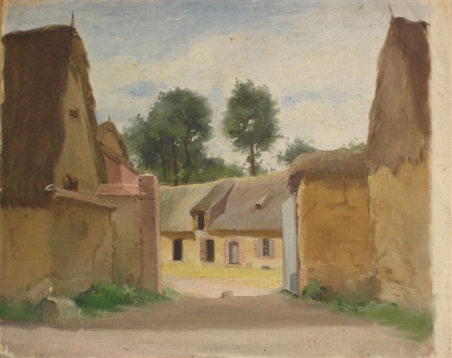 Adrien LAVIEILLE. Portail ouvert sur une cour de ferme. Huile sur toile. 32 x 40 cm.