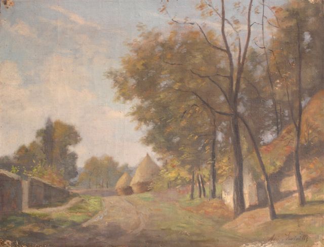 Adrien LAVIEILLE. Chemin de campagne et meules de foins. Huile sur toile. Signée en bas à droite. 31 x 41 cm.