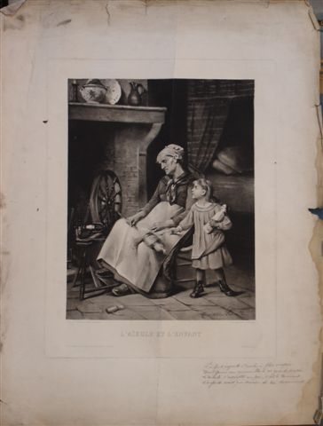Marie-Adrien LAVIEILLE. "L'aïeule et l'enfant". Deux photogravures par H. MANSARD, imprimées par CHARDON (Paris) et éditées par LECADRE, du tableau exposé au Salon des Artistes Français en 1888. 72 x 55 cm. Une est annotée en bas à droite: