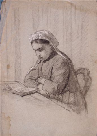 Marie-Adrien LAVIEILLE. Bretonne coiffée lisant. Fusain et rehauts de craie blanche. 41 x 29,5 cm. Au dos étude de pied.