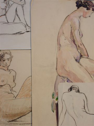 Andrée LAVIEILLE. Lot de trois études de nues. Aquarelle et fusain. 51 x33 cm. Joint deux dessins de nues. Fusain. 24 x 22 cm.