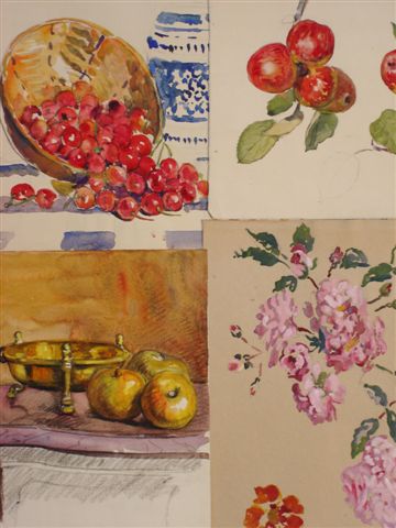 Andrée LAVIEILLE. Lot de sept études à l'aquarelle. Natures mortes, études de pommes, de cerises, et de fleurs ; paysage urbain. Trois signées au dos. Une datée 1937.