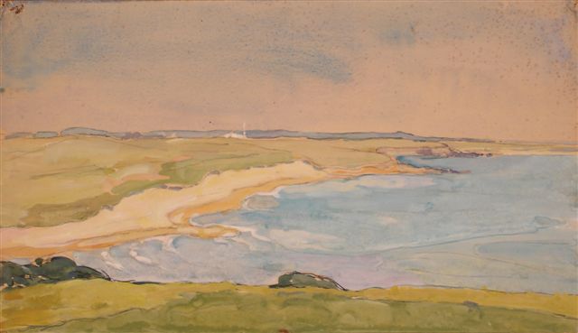 Andrée LAVIEILLE. Vue depuis le Pouldu en direction de Guidel. Aquarelle gouachée. 24 x 42 cm.