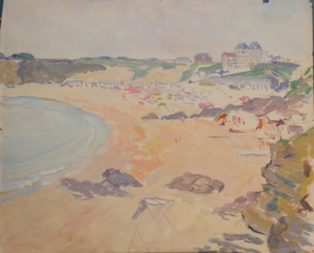Andrée LAVIEILLE. La plage du Pouldu. Huile sur papier. Signée au dos. 50 x 61 cm.