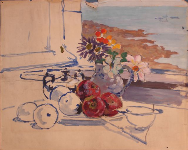 Andrée LAVIEILLE. Castel Karreck ( Le Pouldu). Nature morte à la fenêtre ouverte sur la mer . Huile sur papier. Signée au dos. 50 x 61 cm.