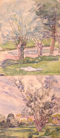 Andrée LAVIEILLE. Le bas Plassac en Gironde. Trognes. Paire d'aquarelles gouachées. Une est signée au dos "Andrée". 32 x 25 ; 26 x 33 cm.