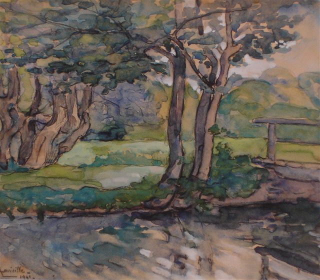 Andrée LAVIEILLE. Le bas Plassac en Gironde: au bord de l'eau. Aquarelle, et fusain. Signée en bas à gauche et datée 1941. 22 x 25 cm.
