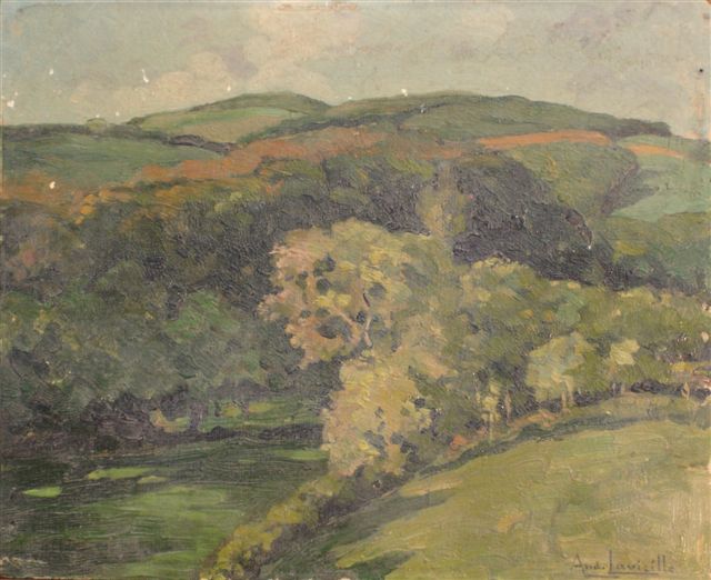 Andrée LAVIEILLE. "Le vallon de Cavé-Erquy". Huile sur carton. Signée, légendée et datée 1922 au dos. 22 x 27 cm.