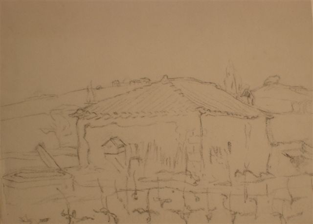Andrée LAVIEILLE. Lot de trois études d'habitations à l'aquarelle et au crayon.