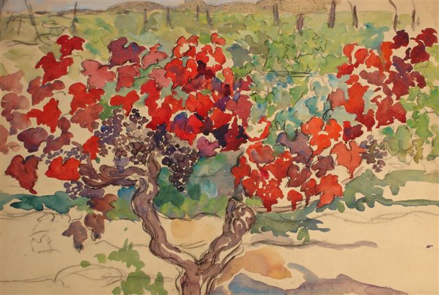 Andrée LAVIEILLE. Ensemble de deux aquarelles. Une étude de feuilles de sureau et "La Vigne en Automne" en Gironde. 38 x 53 cm.