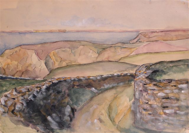 Michel TUFFRAU. Chemin côtier dans la région de la pointe du Raz et de la pointe du Van (Finistère). Aquarelle gouachée. 27 x 37,5 cm.