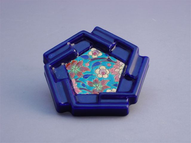 LONGWY. CENDRIER à cinq côtés. Le centre orné d'une composition florale polychrome, les bords en bleu Sèvres.