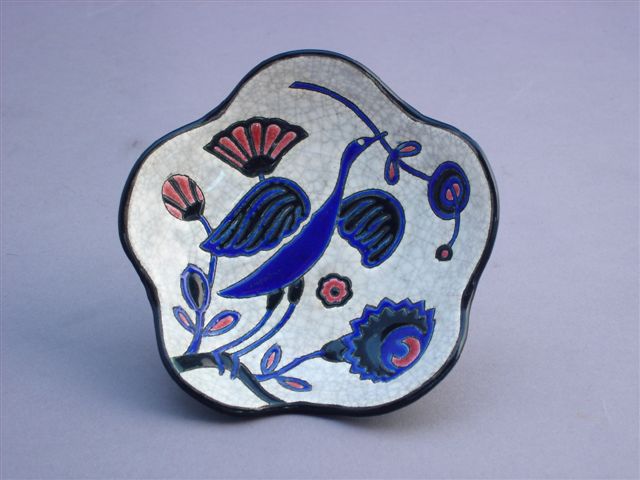 LONGWY. COUPELLE à bords ondulants. Décorée d'un oiseau stylisé s'élançant d'une branche et tenant une fleur dans son bec. Fond blanc craquelé.