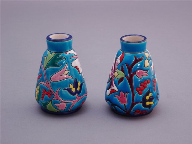 LONGWY. Paire de petits VASES piriformes. Décor de fleurs épanouies polychromes sur fond bleu ciel.