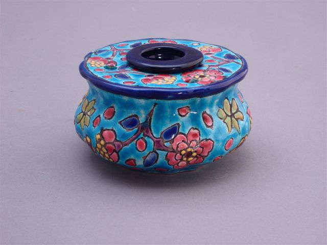 LONGWY, d'après. ENCRIER. Décor de fleurs polychromes sur fond bleu céruléen.