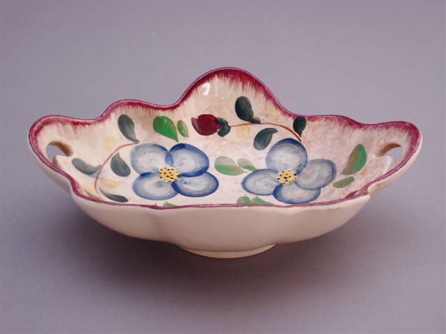 LONGWY. COUPE à FRUITS à bords contournés et ajourés. Décor de trois fleurs sur fond blanc, les bords soulignés d'un peigné fuchsia.