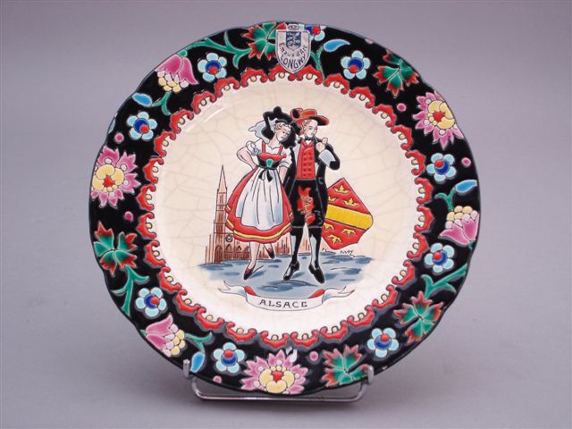 LONGWY. ASSIETTE régionale décorée d'un couple d'Alsaciens en habits traditionnels sur fond blanc craquelé. Le marli souligné d'une frise de motifs rouges festonnés. Sur l'aile, fleurs polychromes sur fond noir.