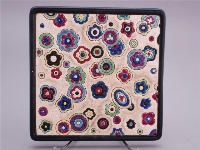 LONGWY. DESSOUS de PLAT carré. Décor d'un semis de fleurs polychromes sur fond blanc craquelé, la bordure en noir.