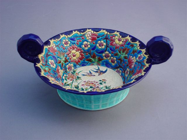 LONGWY. Grande COUPE à oreilles enroulées. Décor sur le fond d'une scène aux deux oiseaux survolant des fleurs, de fleurs polychromes sur l'aile. Le bord externe à motif de quadrillage sur fond bleu.