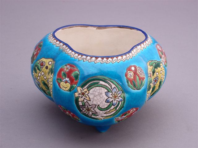 LONGWY, GIEN. POT trilobé reposant sur trois petits pieds. Décor de médaillons de fleurs polychromes en réserve sur fond bleu céruléen.