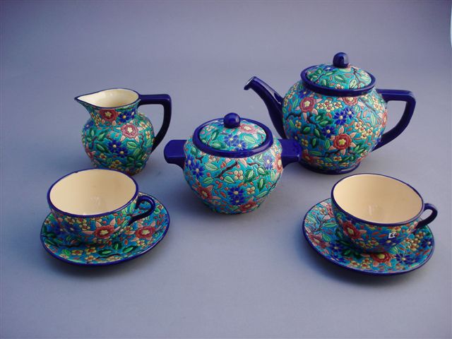 LONGWY. SERVICE à THÉ de 5 pièces comprenant: 2 tasses, 2 sous-tasses, un sucrier couvert, un pot à lait une théière. Décor de fleurs polychromes sur fond bleu turquoise.