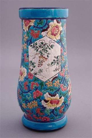 LONGWY. VASE de forme balustre décorée, dans une réserve hexagonale, de feuillages sur fond blanc. La réserve se détache sur un décor traditionnel riche: semis chinois de chrysanthèmes et de pivoines appelé "chrysanthémo-paeonien" par Albert Jacquemard, auteur des "Merveilles de la céramique" (1868). Rehaussé main par D.M.