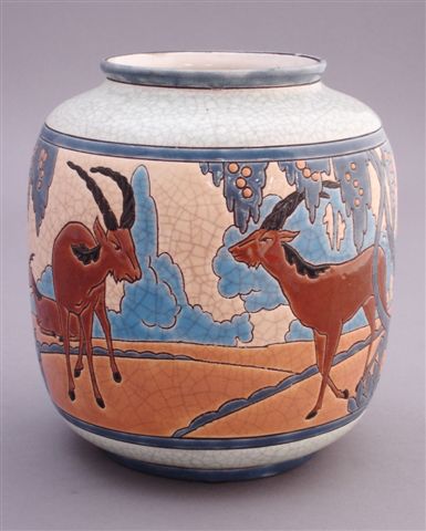 LONGWY. VASE à décor d'une frise d'antilopes dans la nature. La base et le haut du vase en blanc craquelé.