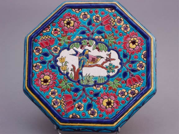 LONGWY, d'après. DESSOUS de PLAT octogonal reposant sur quatre petits pieds, décoré d'une scène aux oiseaux branchés dans une réserve. Décor de fleurs polychromes sur fond bleu céruléen.