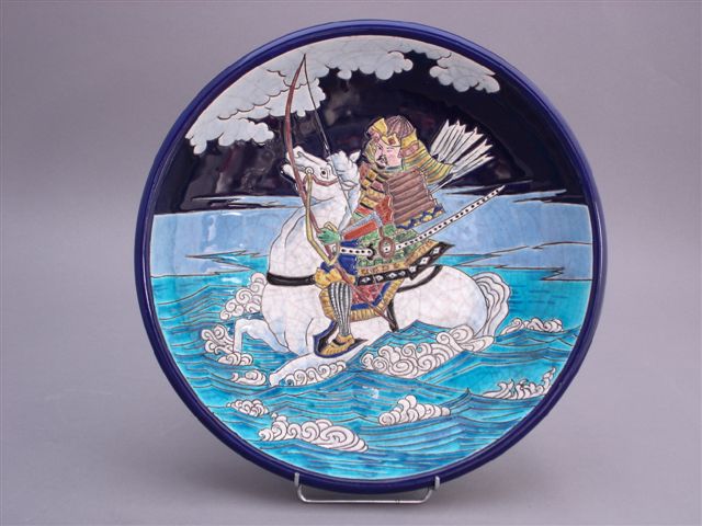 LONGWY. Grand PLAT circulaire orné d'un guerrier japonais à cheval dans les flots.