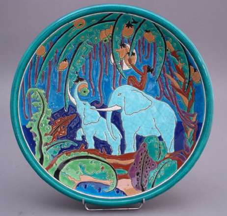LONGWY. Grand PLAT aux éléphants dans la jungle. Une femme nue, sur l'un des éléphants, cueille des fruits. Bordure et aile externe à fond vert.