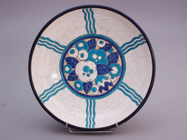 LONGWY. COUPE sur pied. Décor de fleurs en camaïeux de bleu sur fond jaune au centre, l'aile à fond blanc craquelé alternée de séries de trois lignes ondulantes bleues.