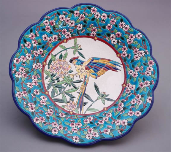 LONGWY, d'après. Grande COUPE sur piédouche à bords chantournés. Décor au perroquet aux ailes déployées et branché sur fond blanc craquelé. L'aile est ornée de fleurs de pommier sur fond bleu céruléen.