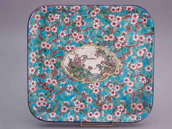 LONGWY. PLAT carré à décor en réserve d'un oiseau près d'un plan d'eau, le cartel se détache d'un semis de fleurs de pommier sur fond bleu céruléen.