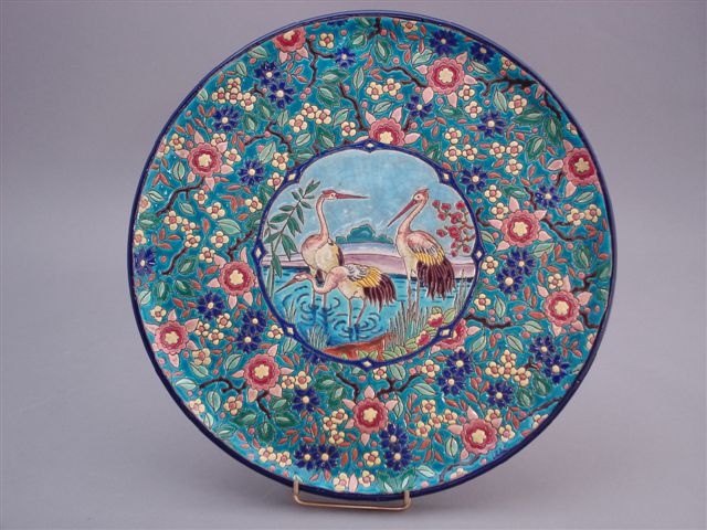 LONGWY. Grand PLAT circulaire, décor en réserve de trois hérons dans un étang, sur fond de fleurs polychromes et fond bleu.