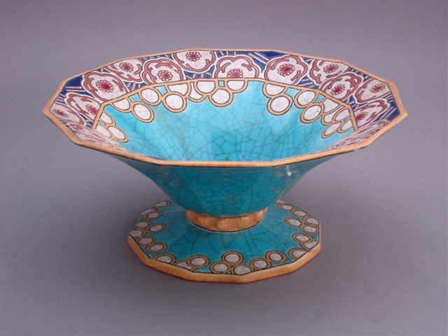LONGWY. Grande COUPE à fruits à douze pans, de forme évasée, reposant sur une base à douze côtés. Décor de fleurs stylisées et de cercles jaunes sur le haut de la coupe et sur la base. Fond bleu turquoise.