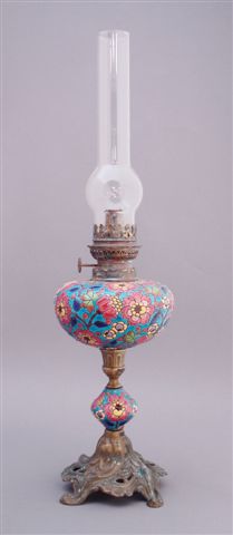 LONGWY, d'après. LAMPE à PÉTROLE à décor d'un oiseau exotique branché dans une réserve, sur fond de fleurs polychromes. Monture en bronze ciselé et doré, la base à motifs d'acanthes enroulées, le fût en forme de vase Médicis.
