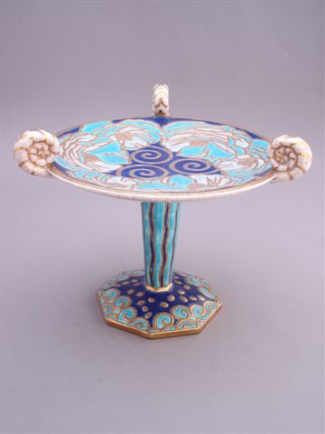 LONGWY. Grande COUPE à fruits circulaire à trois anses enroulées. Décor de fleurs bleues soulignées de doré sur fond bleu foncé, de lignes et d'entrelacs dorés. Le fût fuselé à pans, repose sur une base octogonale.