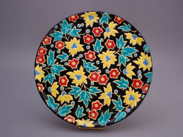 Grand PLAT circulaire décoré dans le goût de Longwy de fleurs jaunes et rouges, de feuillages verts sur fond noir.