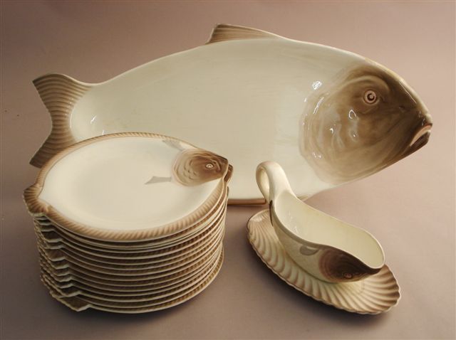 LONGWY. Service à poissons en faïence fine, 17 pièces. Il comprend 15 assiettes, une saucière, un grand plat. Les assiettes, le plat comme la saucière adoptent la forme de poisson. Marque LONGWY FRANCE.