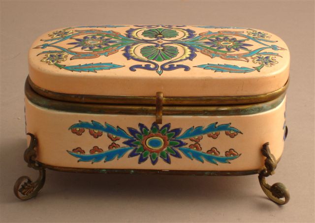 BOÎTE COUVERTE de forme rectangulaire, monture de bronze doré et faïence décorée à la façon de Longwy d'émaux cloisonnés polychromes sur fond saumoné à motif de palmettes, de feuillages, de fleurettes dans le goût persan. Haut. 11, Long. 21, Prof. 12 cm.