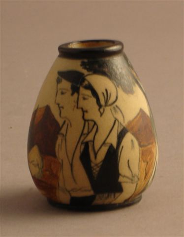 VASE bursiforme au décor de grand feu d'un couple de basques devant une habitation.