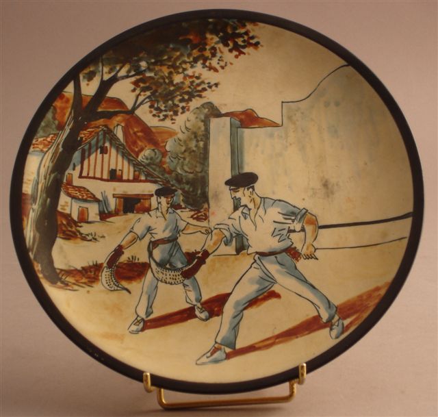 ASSIETTE au décor de grand feu de deux pelotaris aux abords d'une habitation. Marquée RF, signée LE CORRONE.