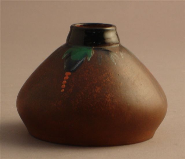VASE de forme conique. Sur le col, décor émaillé de végétaux stylisés sur fond de terre rouge laissée brute.