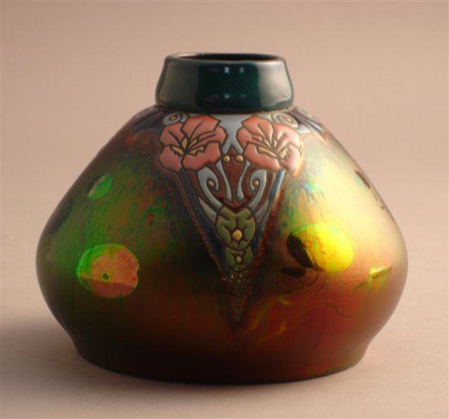 VASE tronconique. Décor en chute de végétaux stylisés en émail cloisonné. La panse est couverte d'émail irisé.
