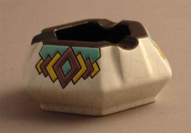 CENDRIER de forme hexagonale, orné d'un décor géométrique d'émaux cloisonnés sur un fond craquelé blanc.