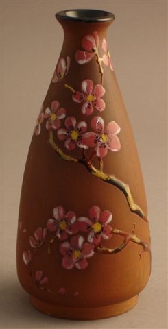 VASE piriforme en terre cuite laissée brute ornée d'un décor émaillé d'une branche de prunier fleurie. Signé à la base "Blois". Porte la signature au revers "Amiens".