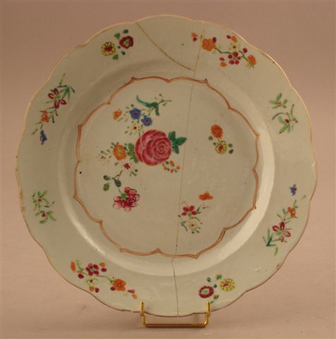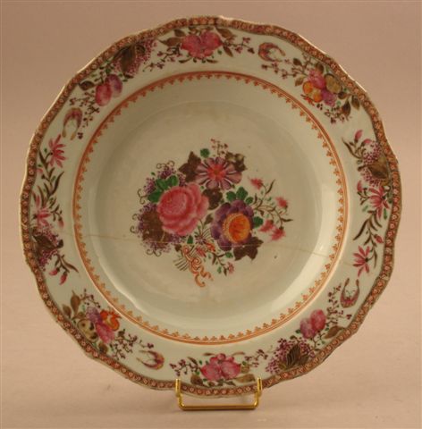 Deux ASSIETTES en porcelaine. L'une est ornée dans le bassin d'un décor de fleurs jetées enserrées dans un cartouche chantourné. Marli agrémenté de fleurs jetées. L'autre est ornée dans le bassin d'un riche bouquet de fleurs. Bassin et marli sont délimités par une double frise. Marli décoré de nombreux bouquets peuplés de papillons. Bord chantourné, souligné d'une frise géométrique.