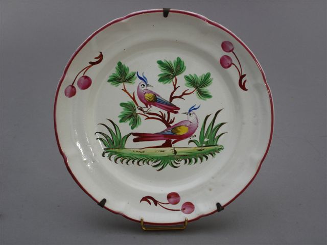 ASSIETTE en faïence à bord contourné, à décor de petit feu polychrome. Le plat est orné d'une composition aux oiseaux exotiques, l'un branché, l'autre dans la verdure. L'aile est décorée de cerises.